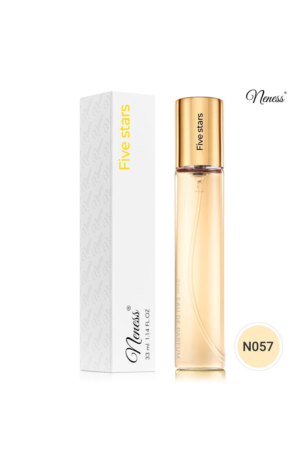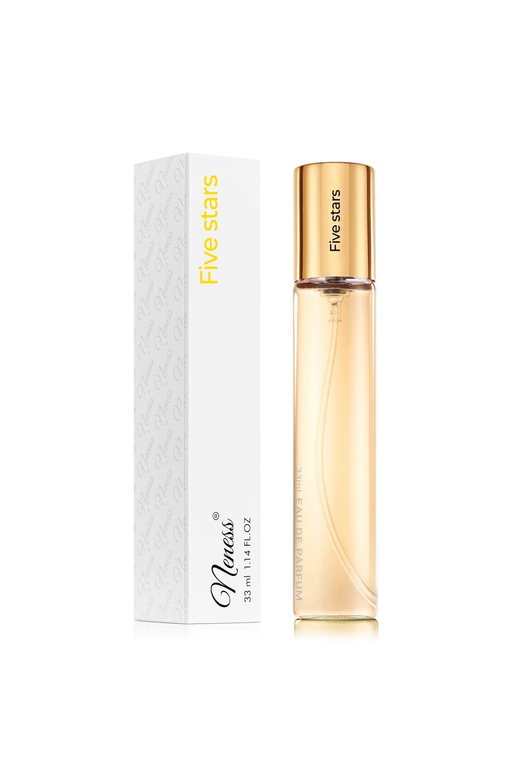 Kvetinová vôňa uzavretá v klasickom 33ml flakóne 33. Parfum pre dámy Neness Five Stars - Vás prenesie na romantickú cestu starým Parížom. Parfum Neness Five Stars vás zavedie do doby, kedy ženy každý deň chodili v elegantných šatách, a v parížskych reštauráciách bol cítiť dym cigár. Zmes zachováva konvenciu najpopulárnejšej kompozície sveta, pôsobí intenzívne v kombinácii s jemnou delikátnosťou. Takáto zmyselná kombinácia protikladov je možná vďaka použitiu esencií z neroli, ruže, santalového dreva a ylang-ylangu, ktoré tvoria spoločne výrazný celok, ktorý zostáva na koži po celý deň. Parfum pre dámy Neness Five Stars je v elegantnom flakóne s objemom 33 mililitrov s rozprašovačom. Vstreknite si do výstrihu, na krk a na zápästie predtým, ako opustíte dom, aby ste si v každej situácii mohli vychutnať klasický a nadčasový nádych ženskej krásy.
