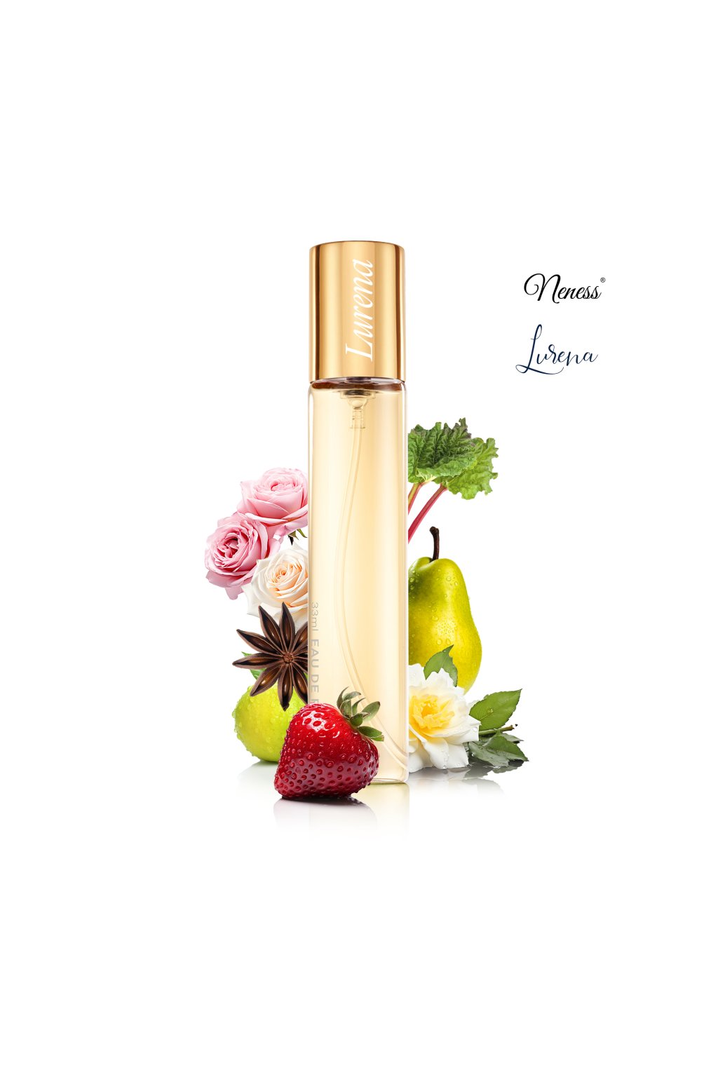 Neness Lurena je parfumovaná voda pre ženy, ktorá sa vyznačuje bohatou a komplexnou arómou. V hlave tejto vône sa miešajú svieže a ovocné tóny rebarbory, jahody a sušeného ovocia s jemným nádychom anízu a bergamotu, čo vytvára lákavý a energický úvod. Srdce parfumu odhaľuje kvetinovú symfóniu gardénie, ylang-ylangu a ruže, doplnenú šťavnatými akordmi hrušky a kvetu pomarančovníka, ktoré prinášajú vôni jemnú eleganciu a sviežosť. Základné tóny pižma, machu, kože a pačuli dodávajú parfému hlbokú a zmyselnú stopu s nádychom prírodnej harmónie. Neness Lurena je perfektnou voľbou pre ženy, ktoré hľadajú sofistikovanú a zároveň výnimočnú vôňu, ktorá podčiarkne ich jedinečný štýl a osobnosť.