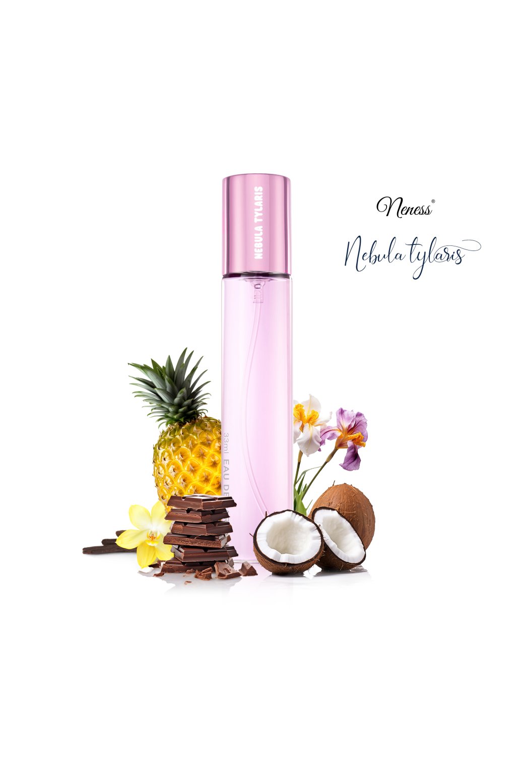 Neness Nebula Tylaris je parfumovaná voda pre ženy, ktorá vás očarí svojou exotickou a sladkou arómou. V hlave tejto vône sa miešajú tóny kokosu a vanilky, ktoré prinášajú krémovú a lahodnú sviežosť. Srdce parfumu tvorí kombinácia ananásu a dračieho ovocia, ktoré dodávajú vôni ovocný a tropický nádych. Základné tóny tvoria drevo, mach a pralinka, ktoré parfumu prepožičiavajú hĺbku a sladkosť s jemným dotykom zemitej elegancie. Neness Nebula Tylaris je ideálnou voľbou pre ženy, ktoré túžia po výraznej a nezabudnuteľnej vôni, ktorá podčiarkne ich jedinečnosť a štýl.